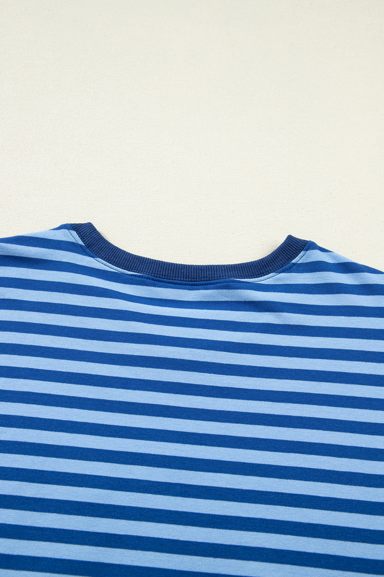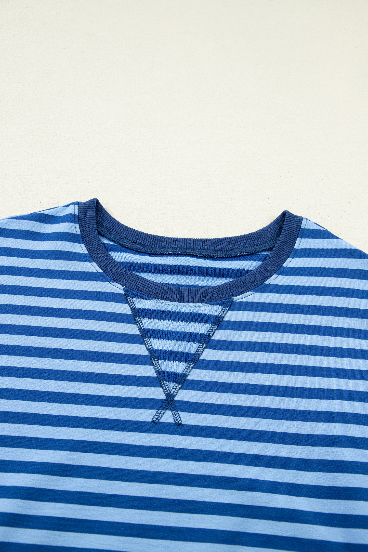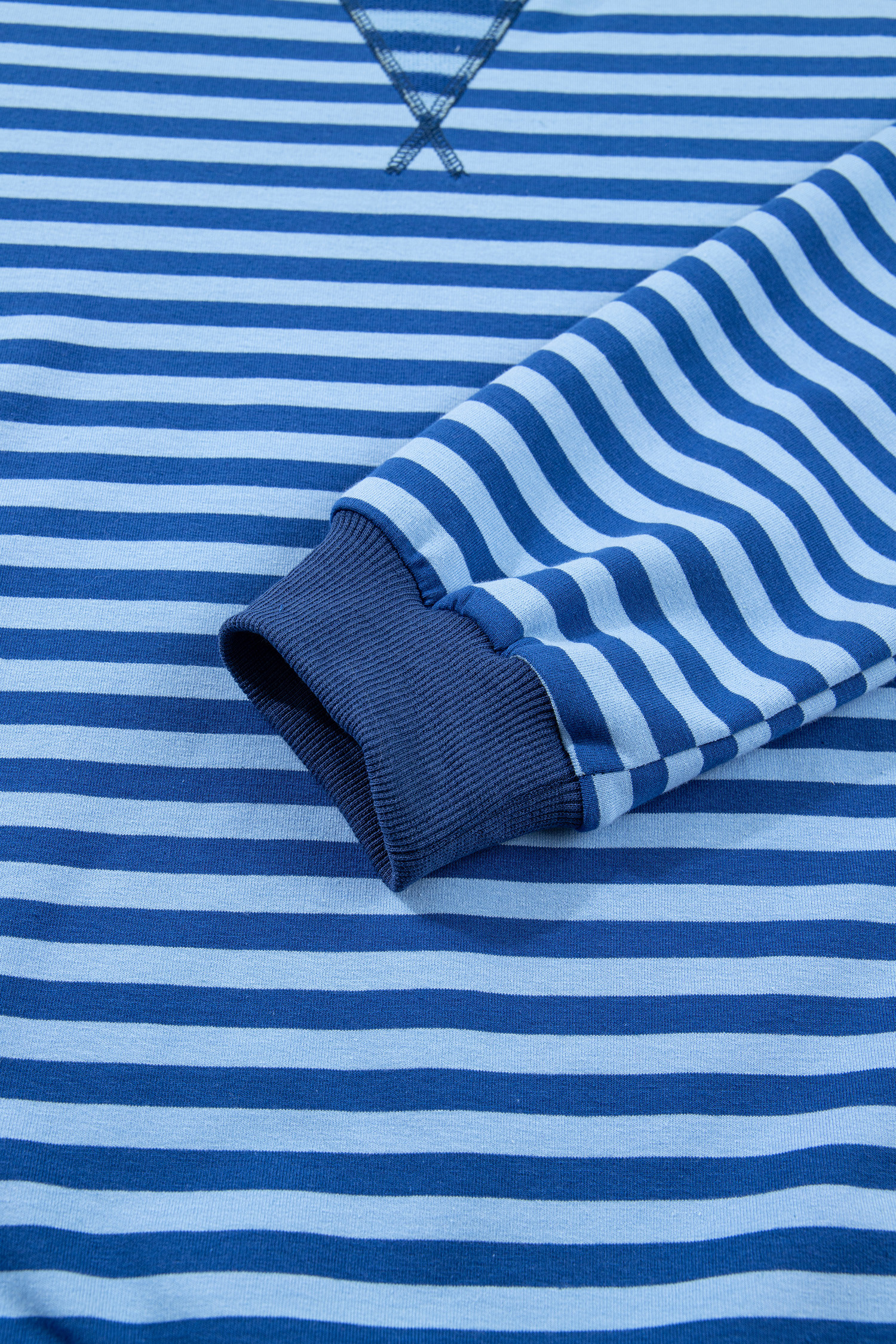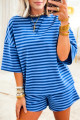 Modri črtasti pulover z dolgimi rokavi, spuščenimi rameni in elastičnim pasom, prost kratek komplet