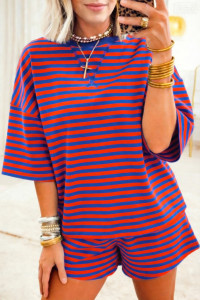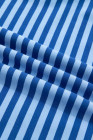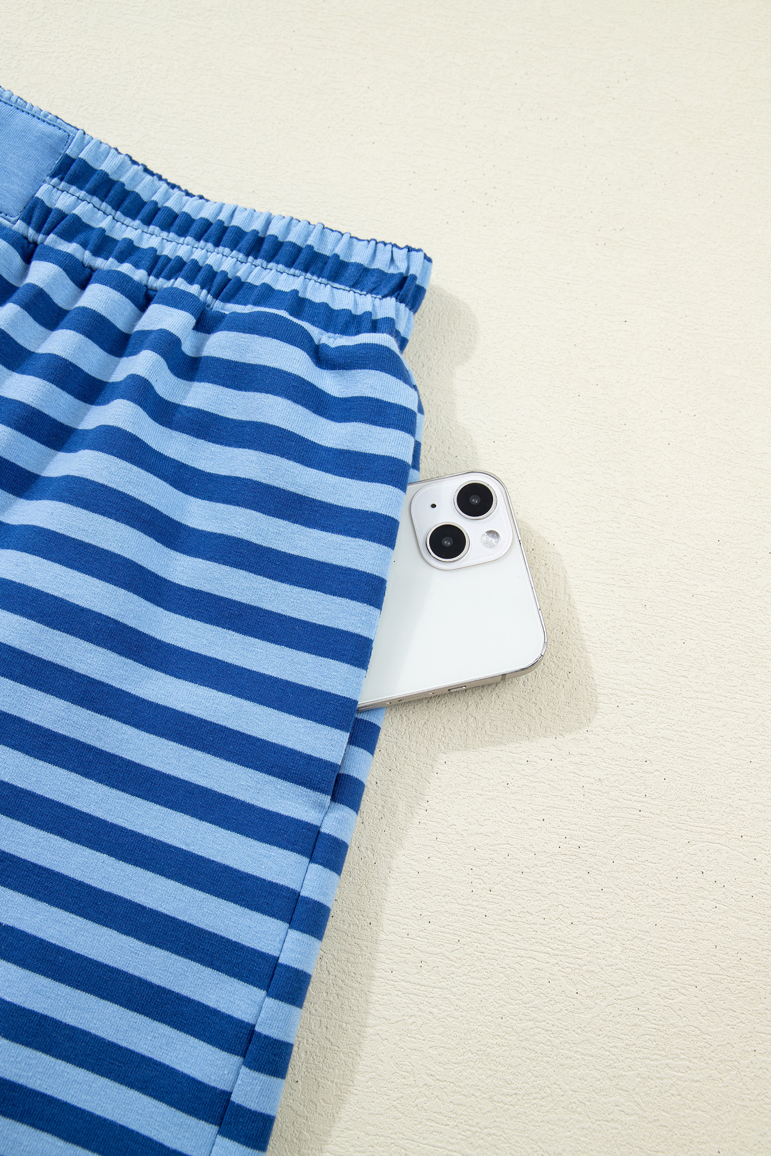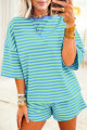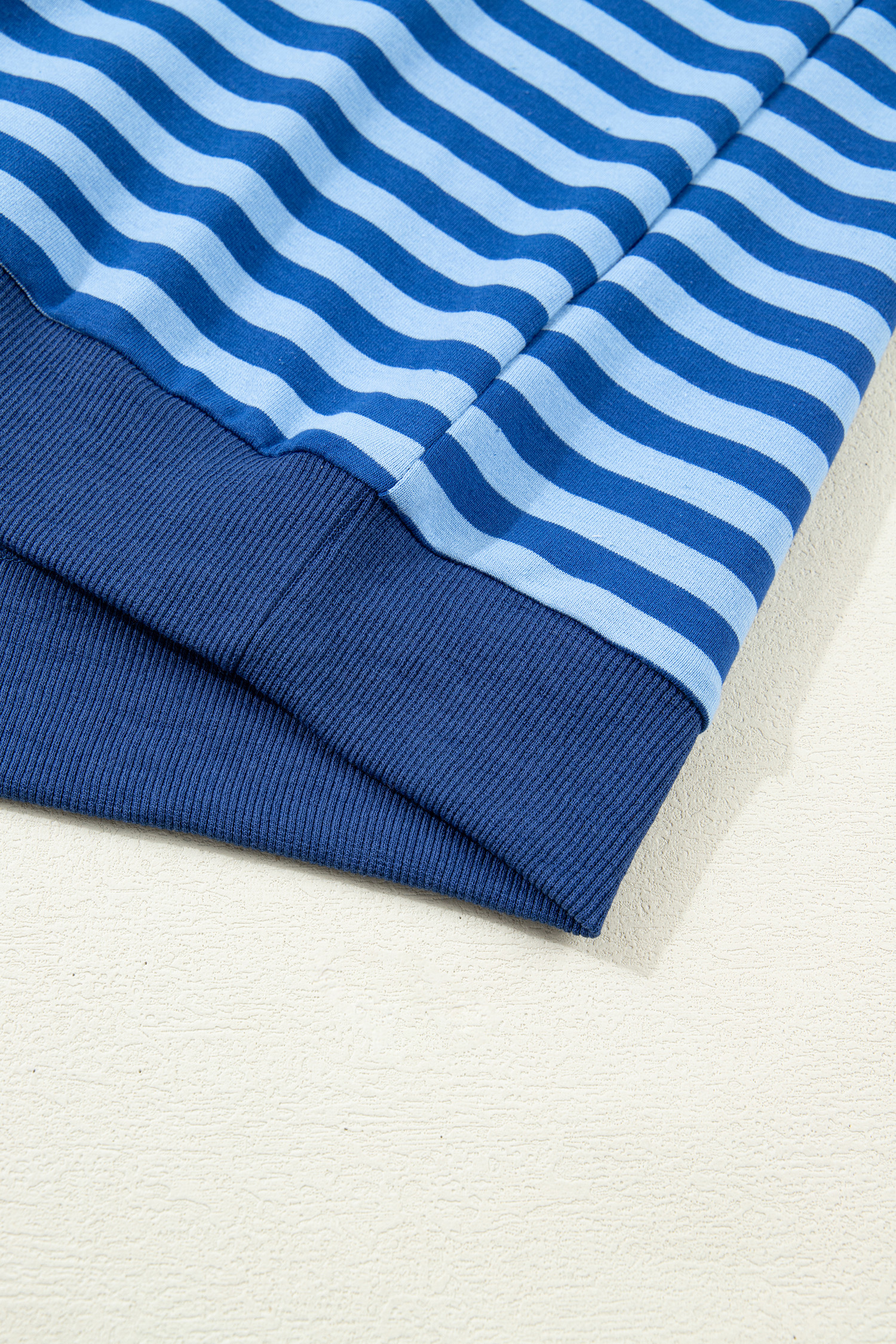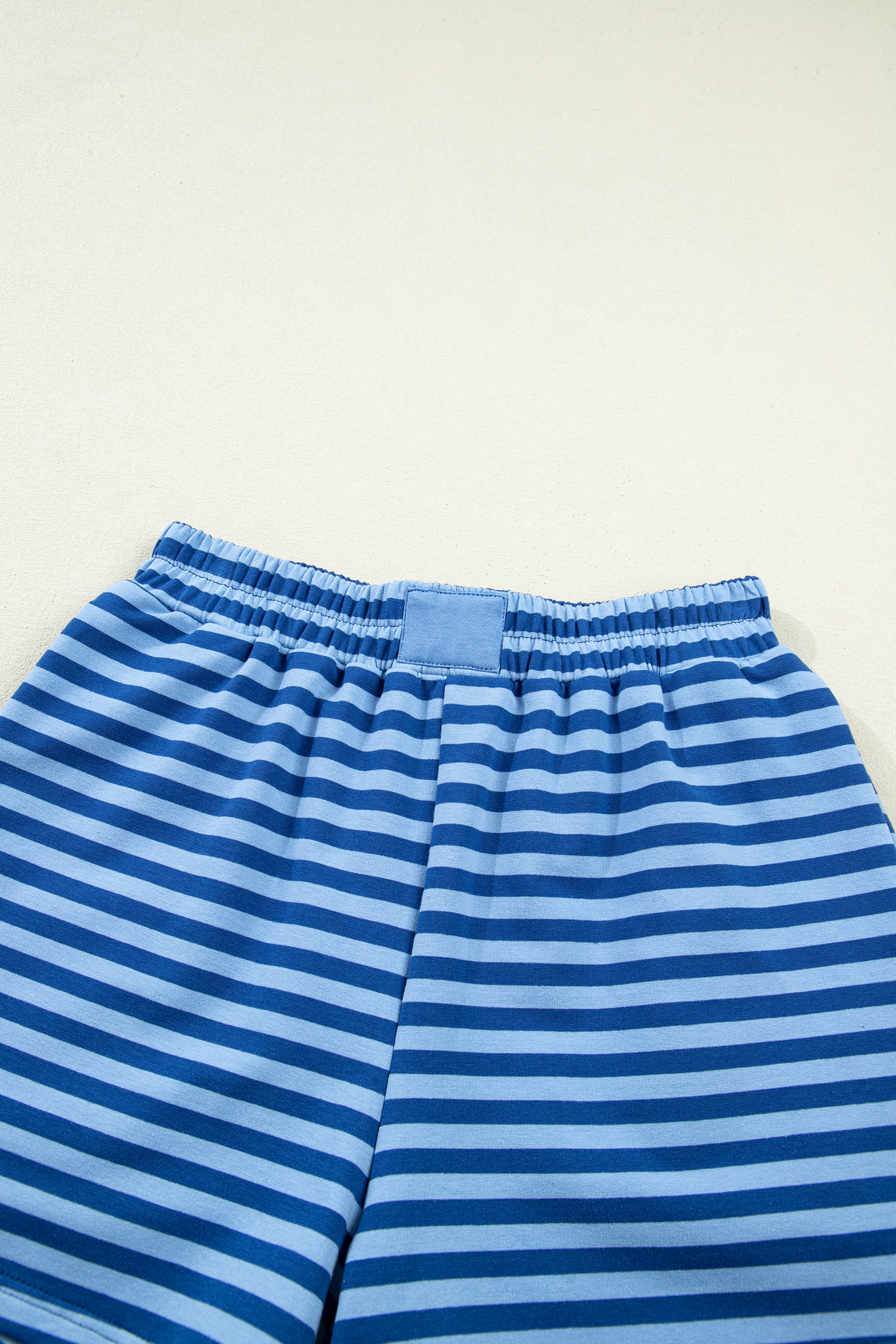 Modri črtasti pulover z dolgimi rokavi, spuščenimi rameni in elastičnim pasom, prost kratek komplet