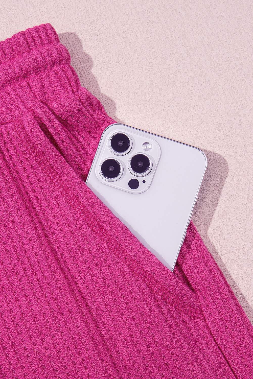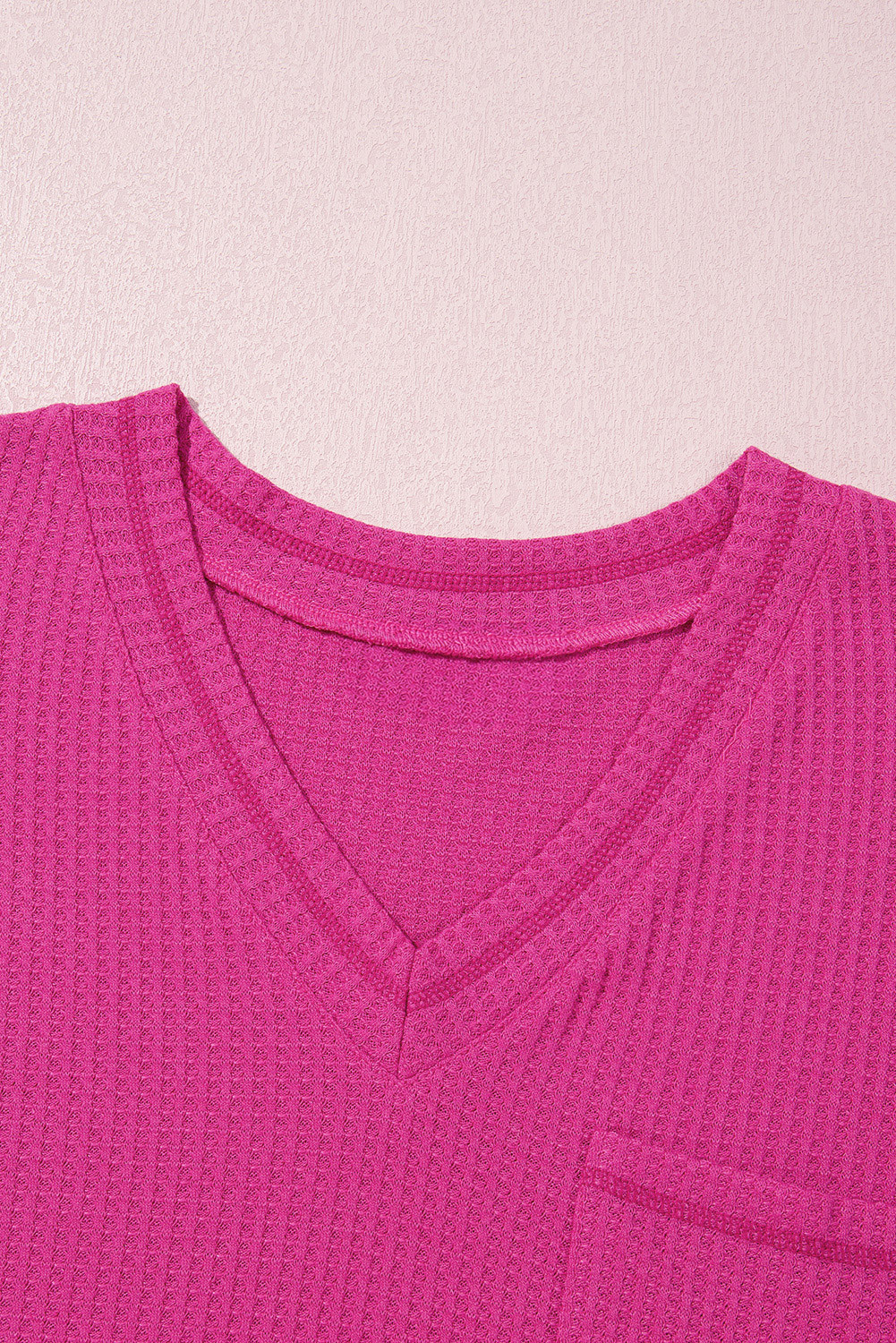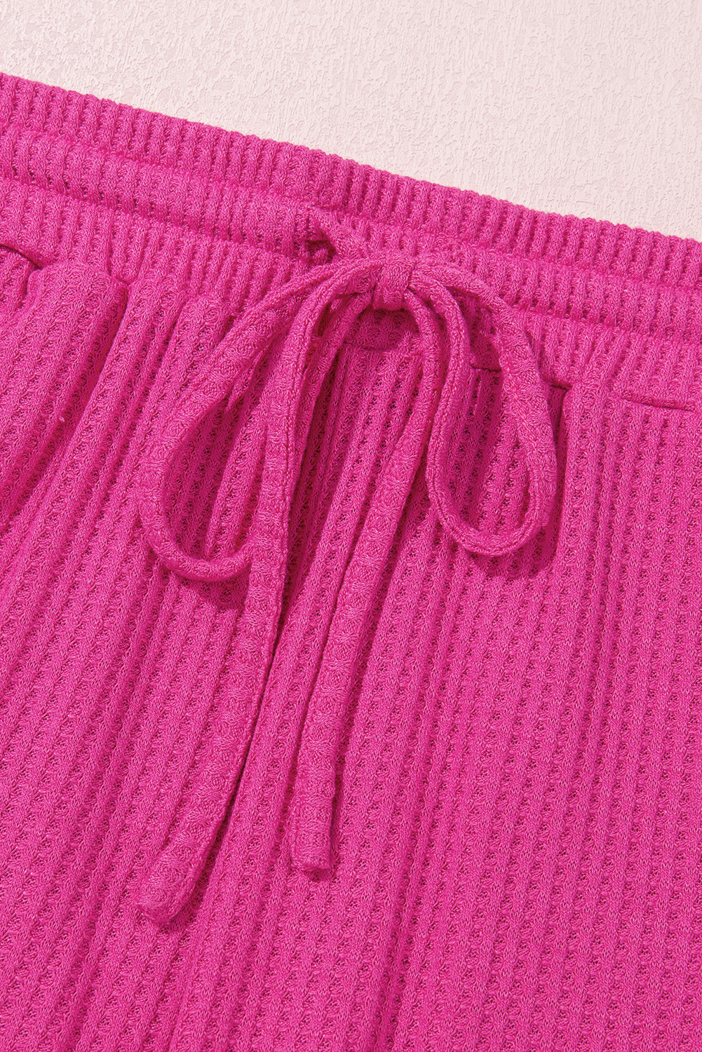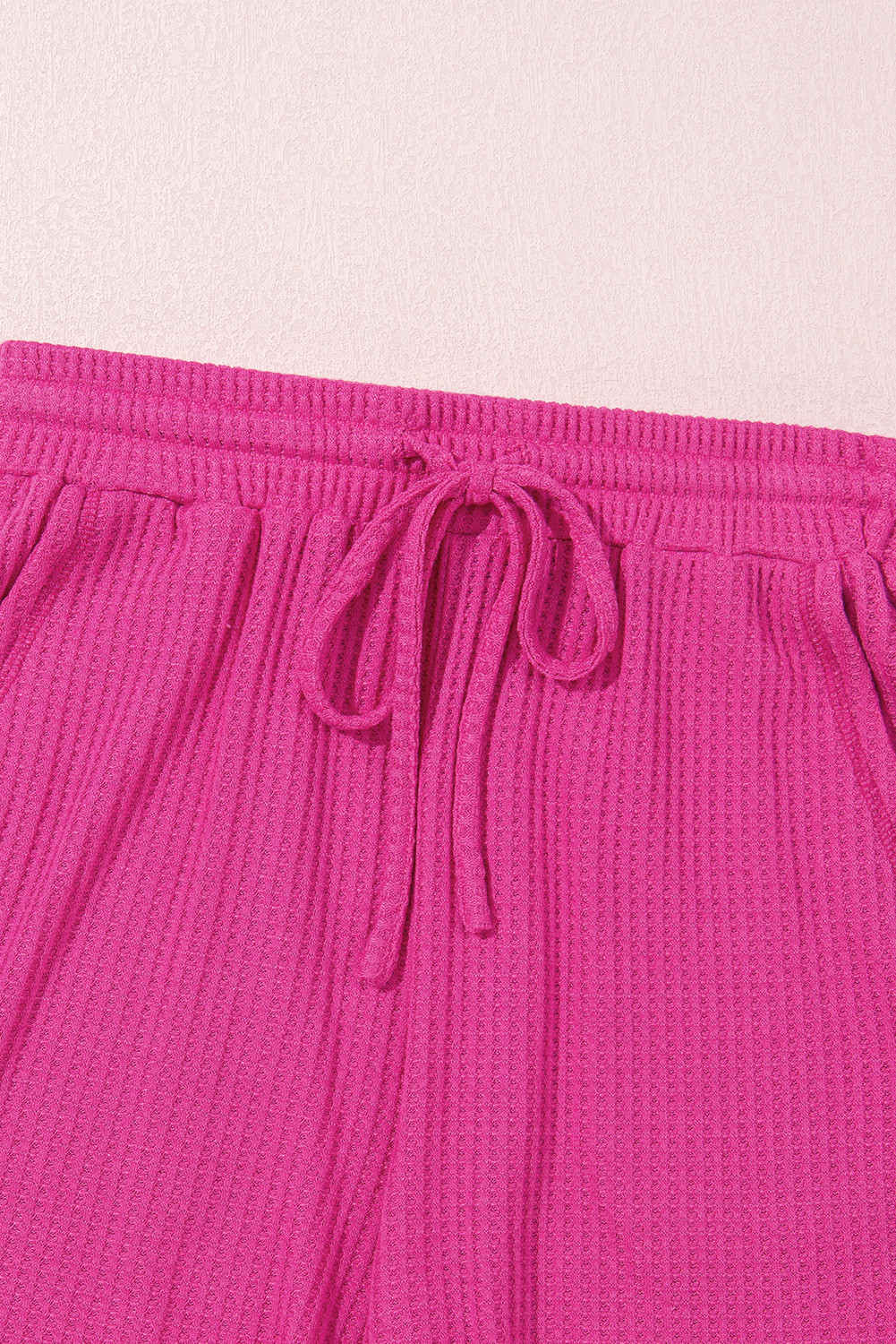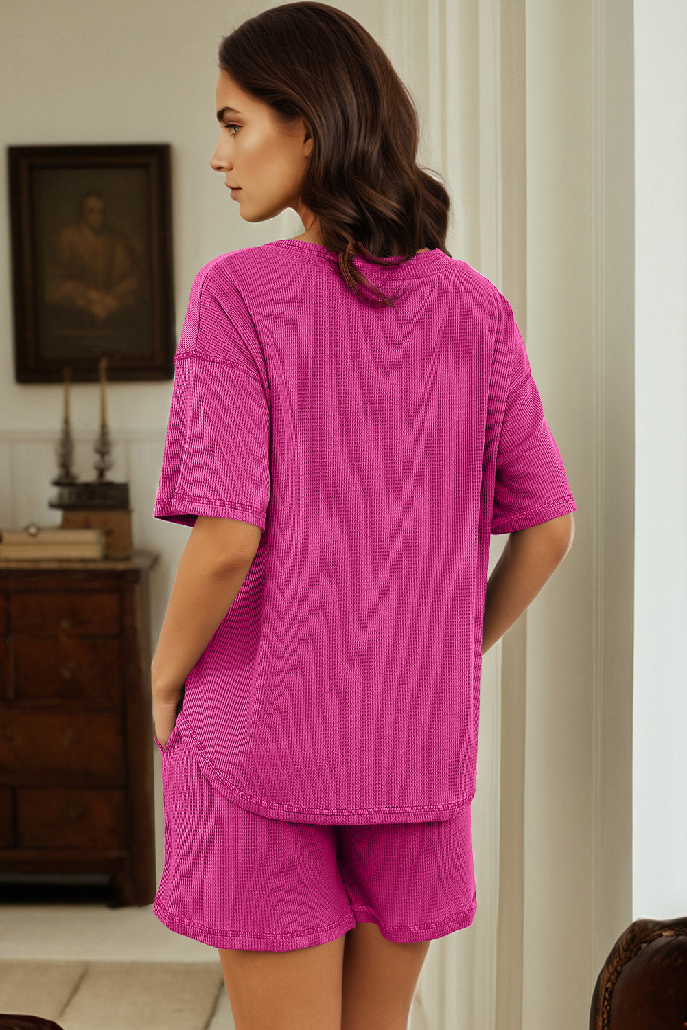 Komplet kratkih hlač z vrvico in rose rdečo enobarvno majico z izrezom v obliki črke V