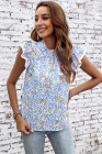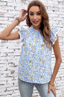 Nebesno moder top z abstraktnim potiskom in visokim ovratnikom ter plapolajočimi rokavi