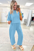 Komplet nebeško modre majice s spuščenimi rameni in hlač s širokim pasom