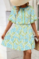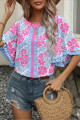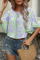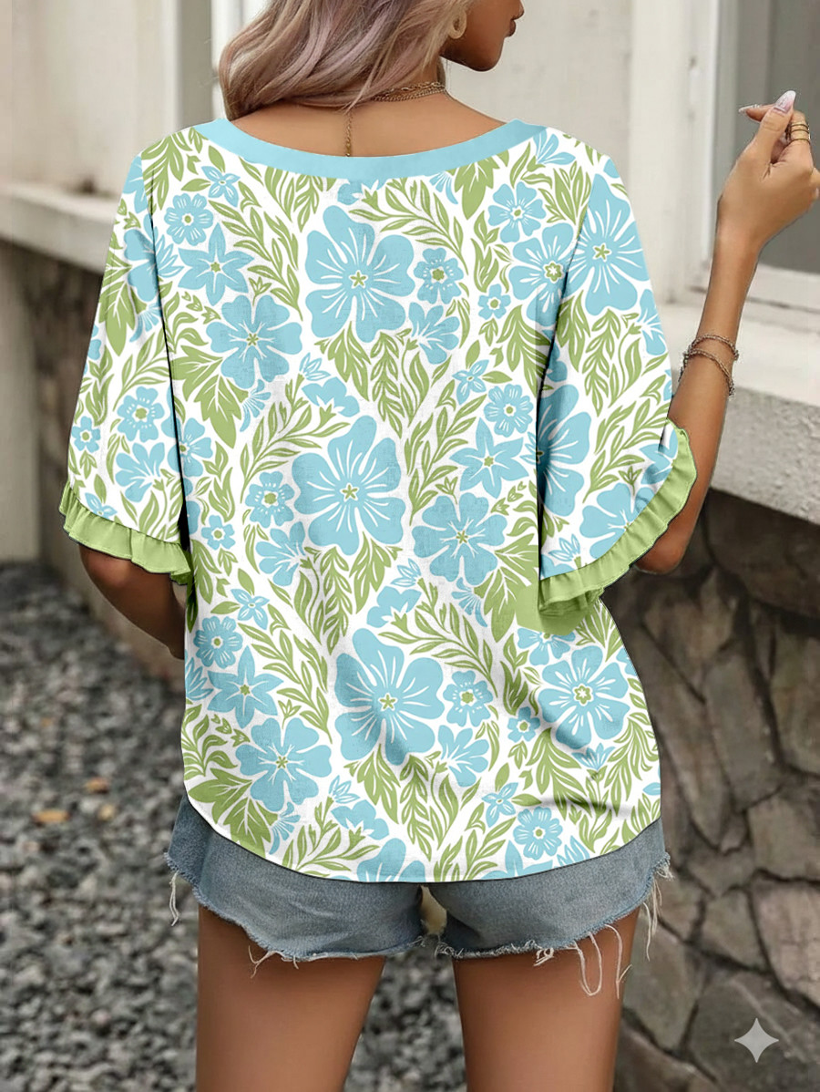 Nebesno modra bluza s cvetličnim potiskom in nabranimi barvnimi bloki ter pol rokavi